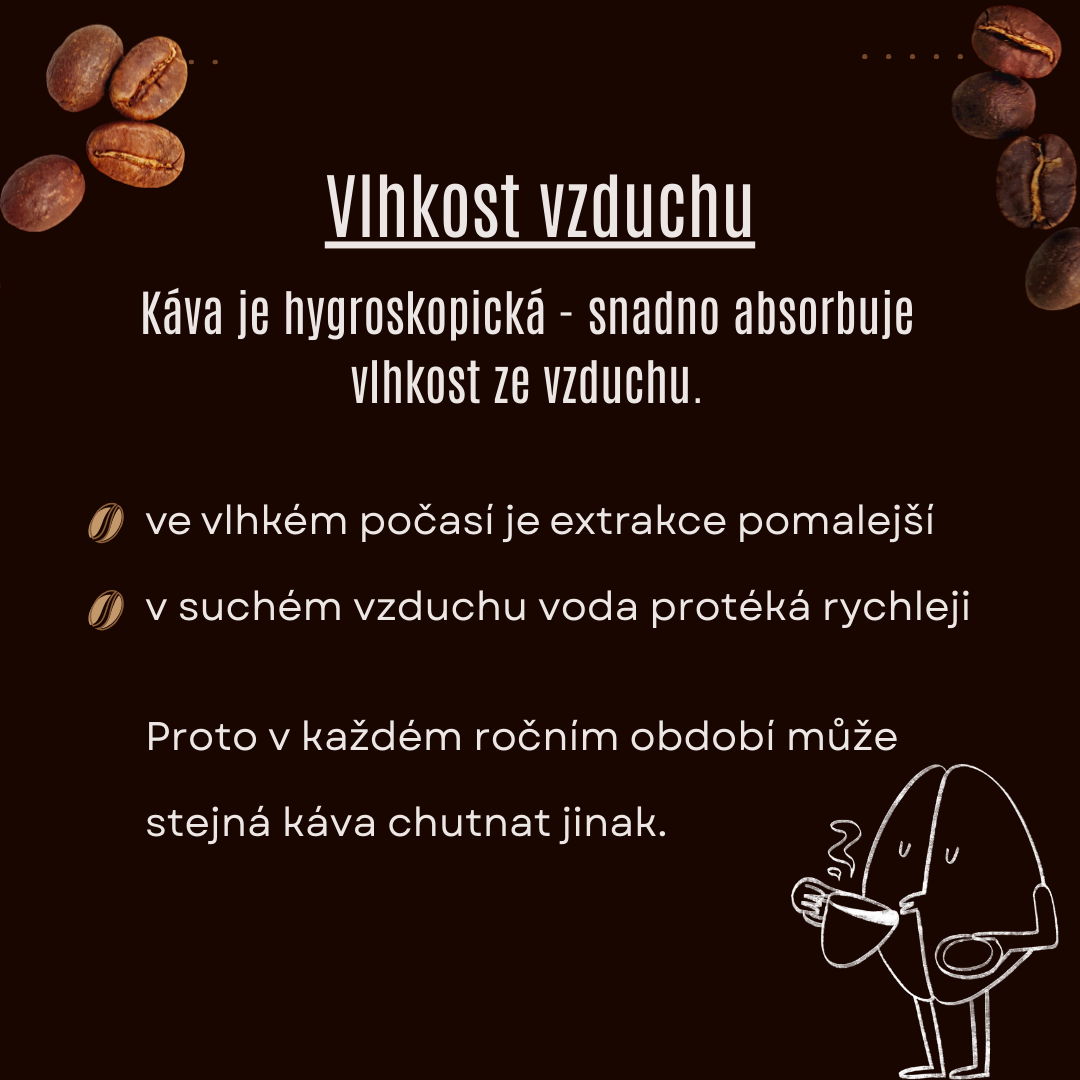vlhkost vzduchu - ovlivňuje mletí i extrakci, ve vyšší vlhkosti extrakce trvá pomaleji