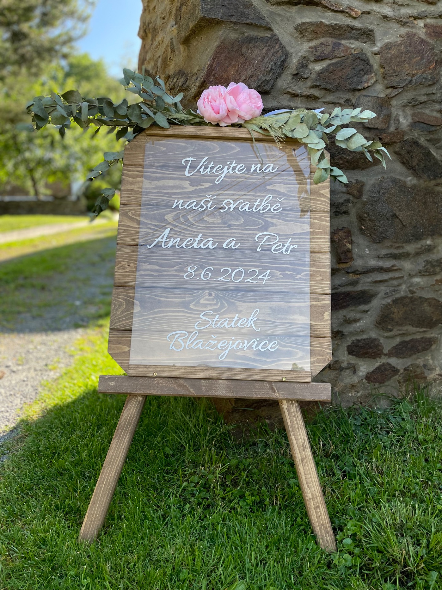 Ručně malovaná cedule je krásným prvním dojmem Vašeho velkého dne. Každý kousek je originál – text i font přizpůsobím Vašim přáním, aby vše dokonale ladilo s atmosférou Vaší svatby.